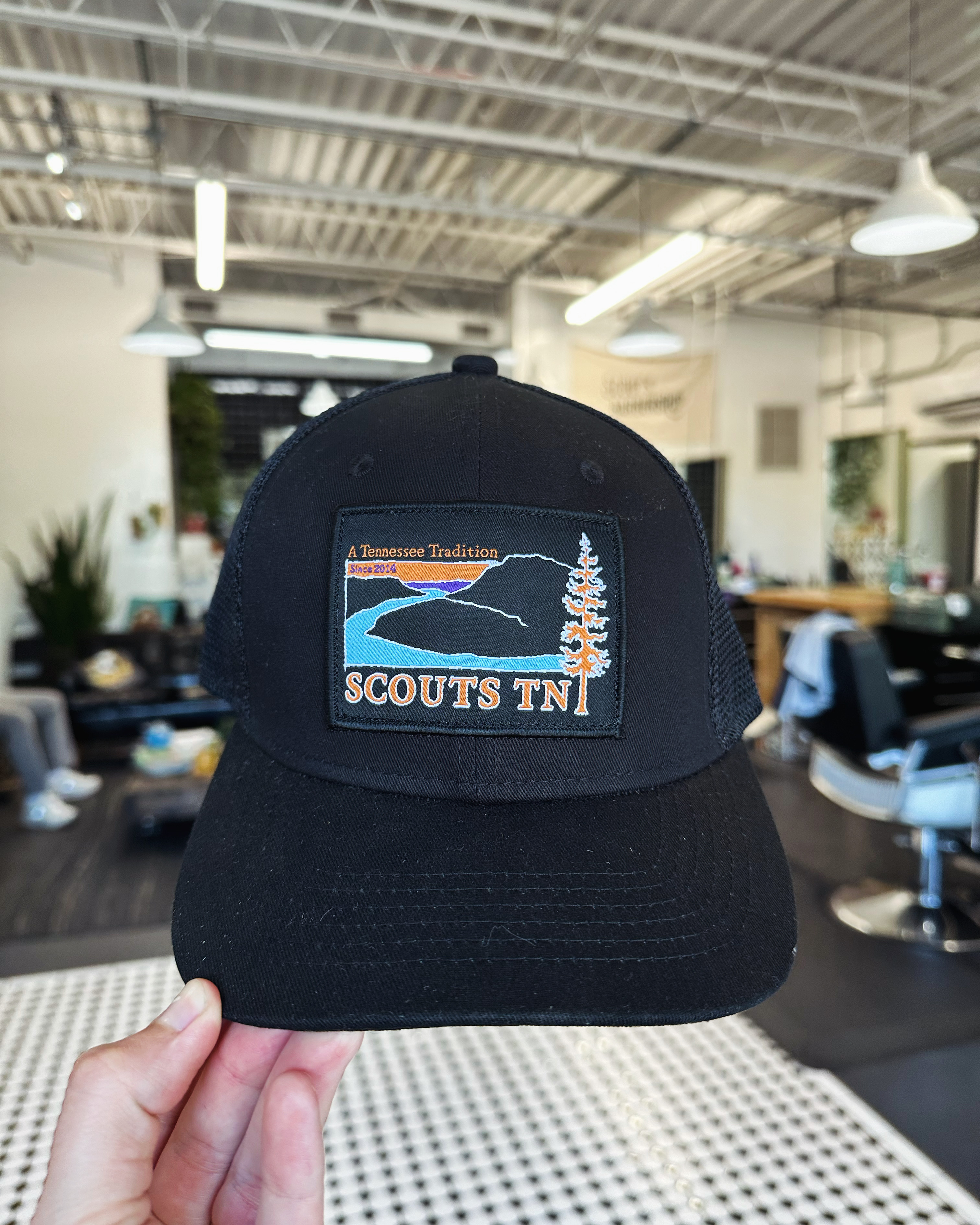 Black, adjustable trucker hat. Custom embroidered patch, locally made in Nashville, TN.
